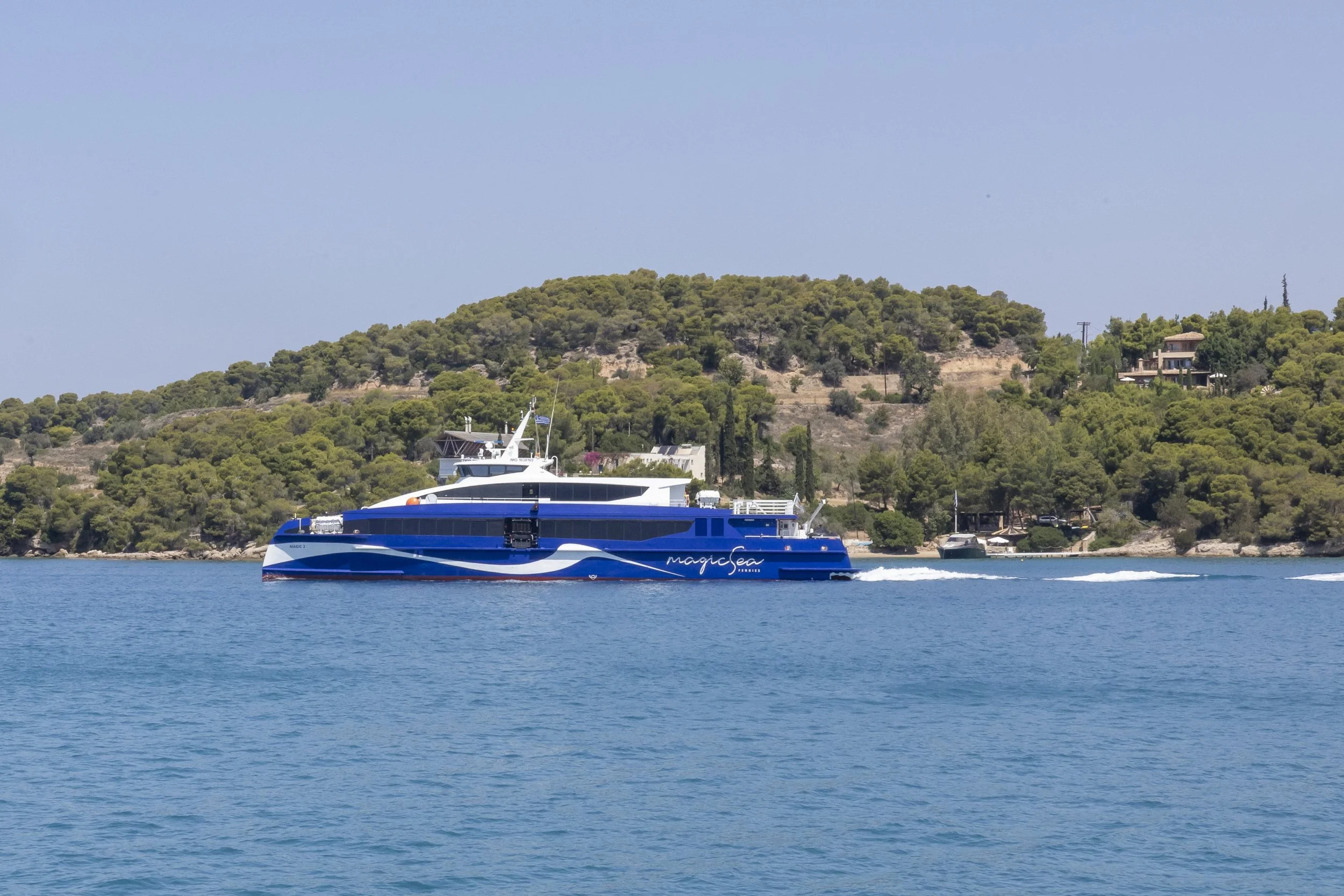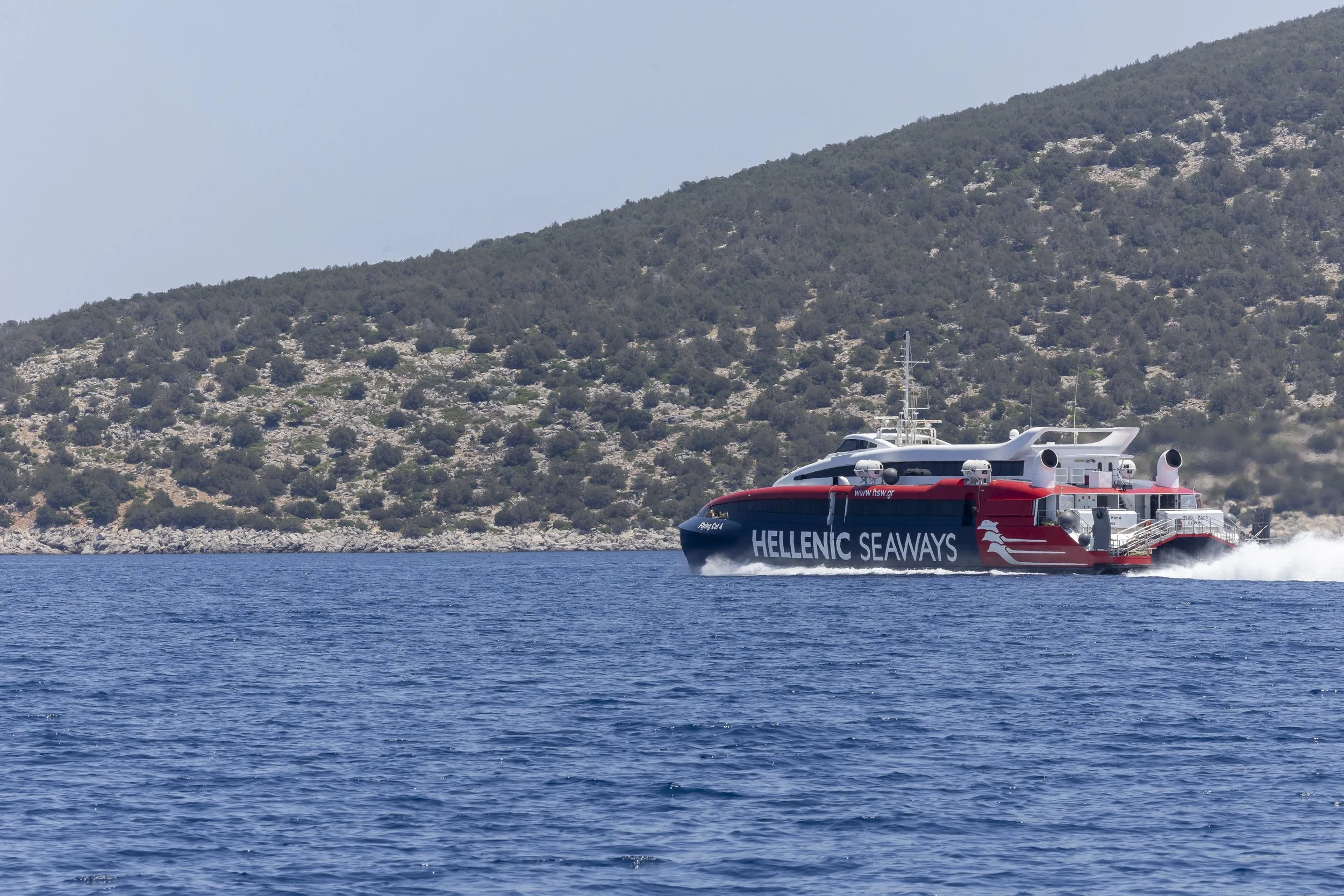 We halen enkele catamarans in, tot onze verbazing. We zagen in Porto Cheli al de ferry van MagicSea uitvaren. Tussen Dokos en het vasteland passeert Hellenic Seaways nogmaals, ditmaal vriendschappelijk.