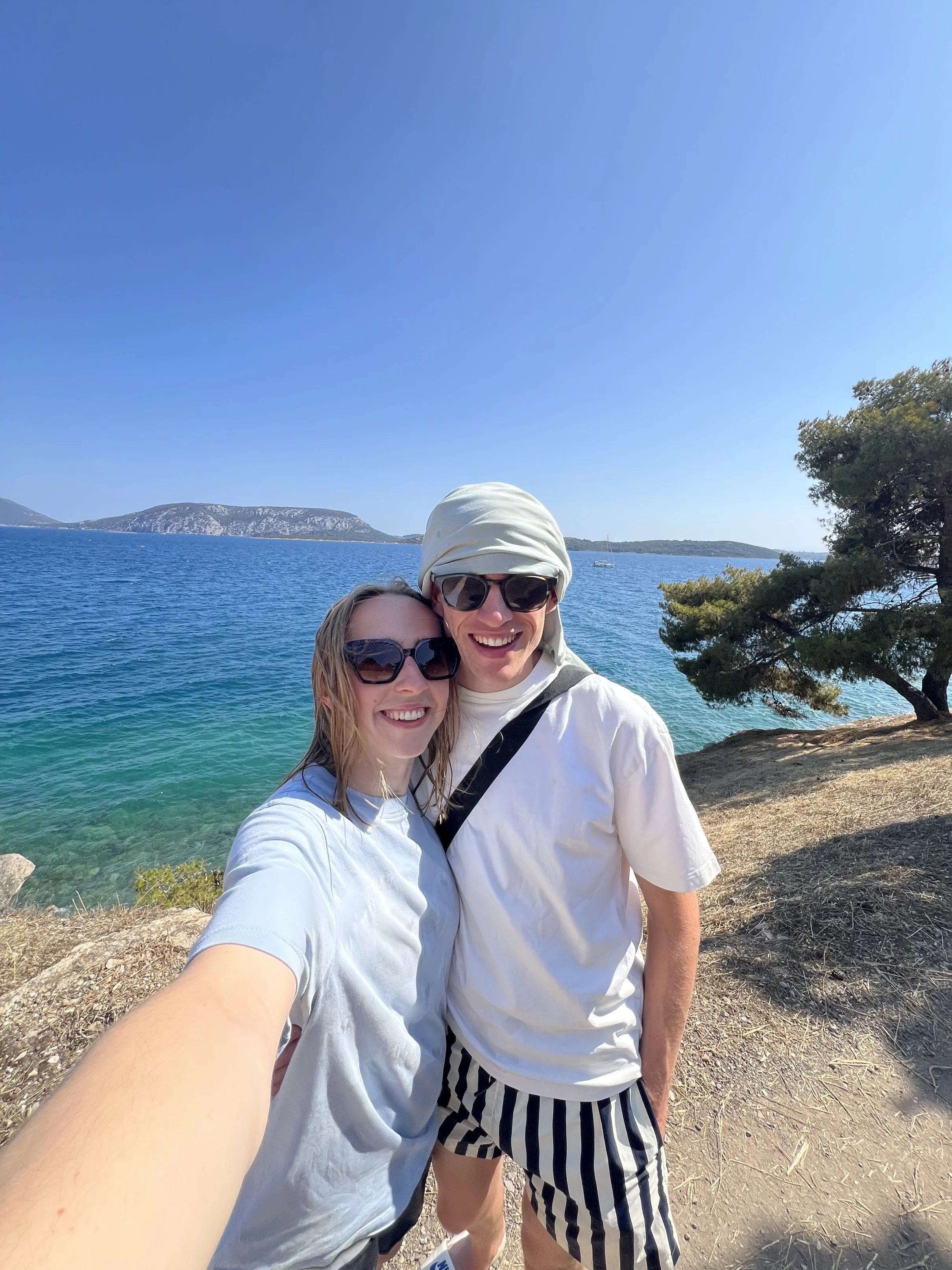 Lore en Mats brengen de namiddag door in het natuurgebied aanliggend aan Ermioni, Bisti-bos, een landtong met aangeplant cederbos. Vanop zee biedt dat een heel aantrekkelijk aanzicht. Dat wordt bevestigd door onze wandelaars.