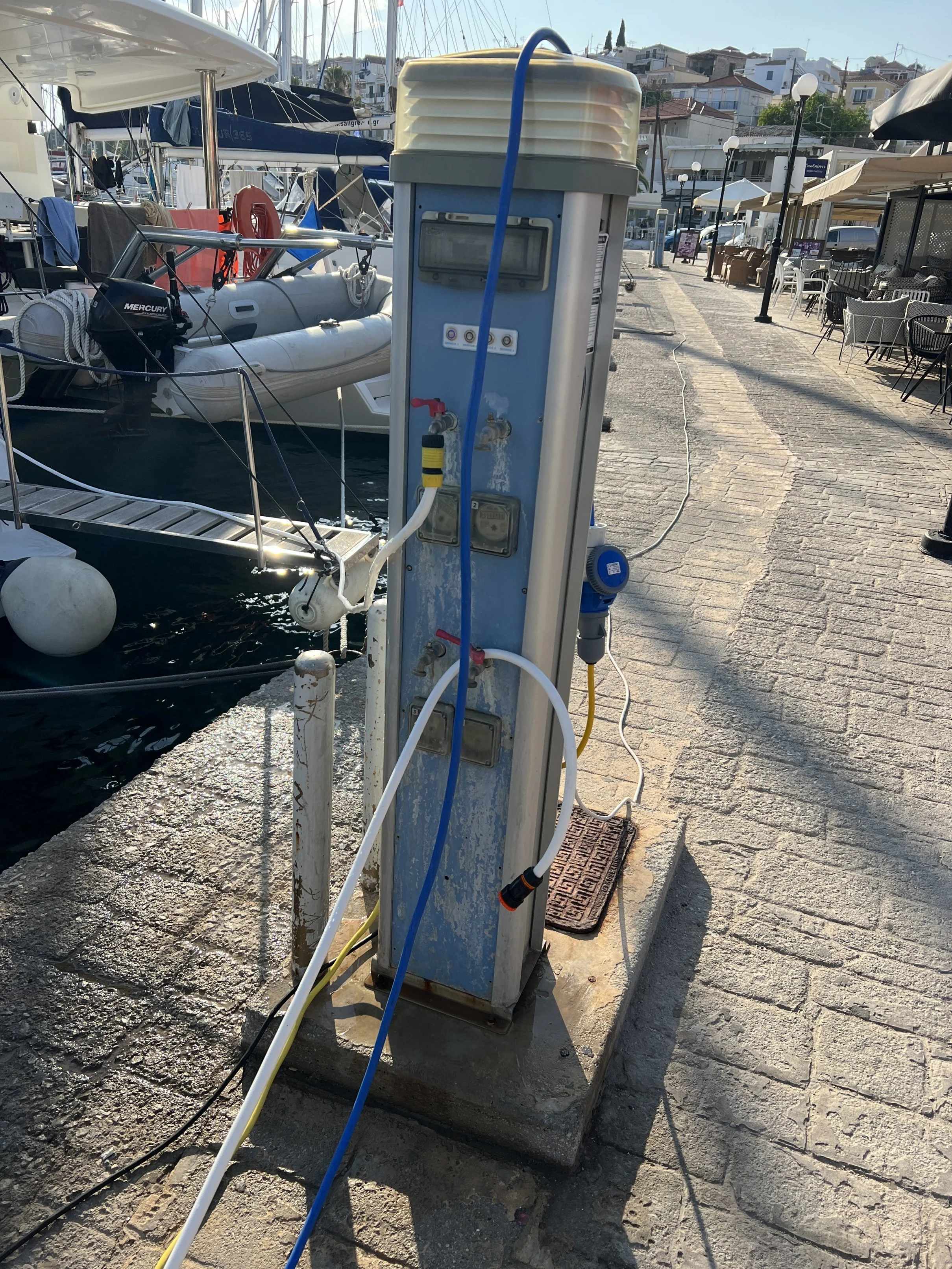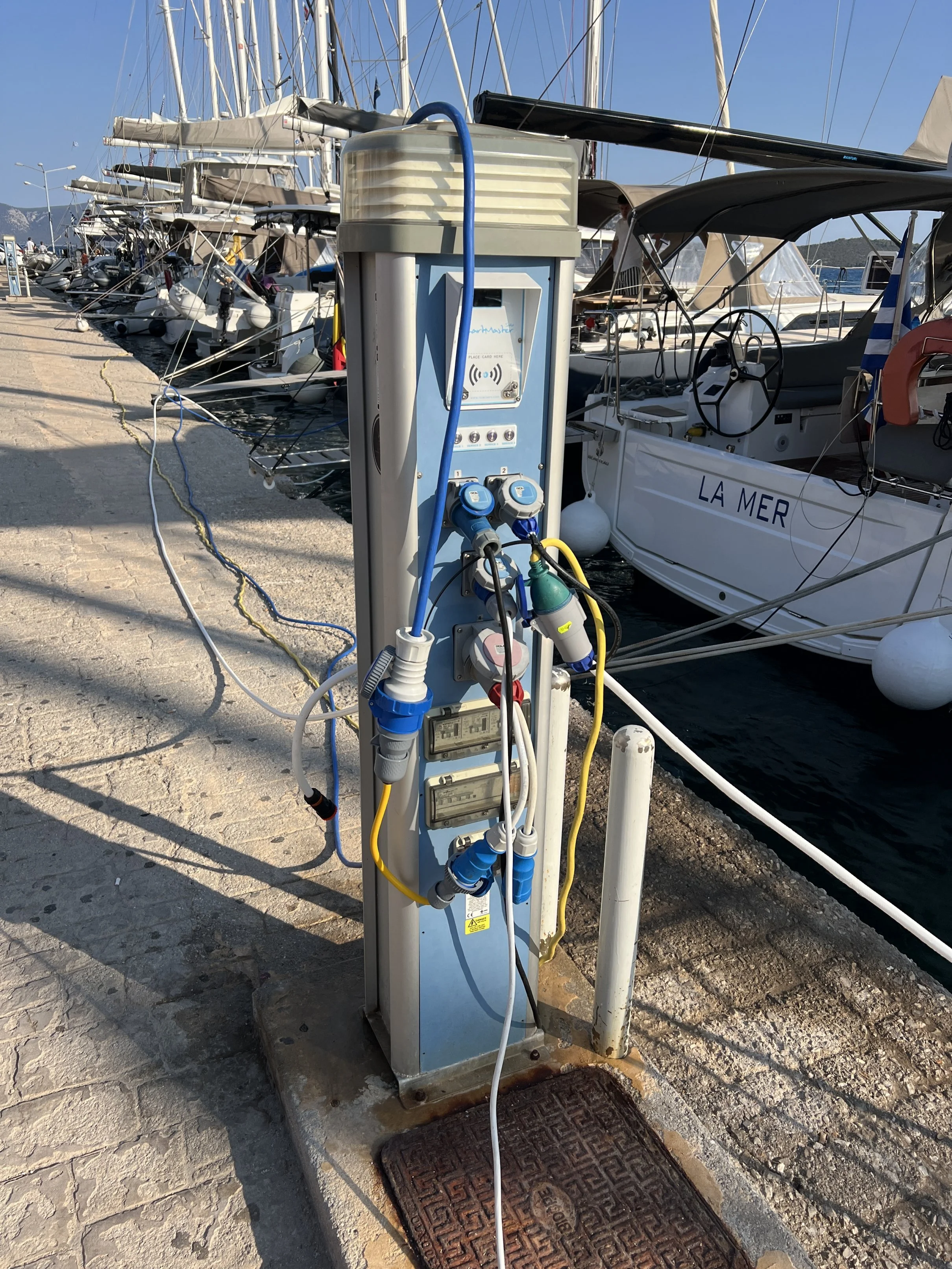 Wanneer we terug bij de boot zijn, blijken alle nutsvoorzieningen benomen. We schatten dat er drie aansluitingen voor electriciteit en twee voor water zijn per zes ligplaatsen. Dat is vragen om problemen.