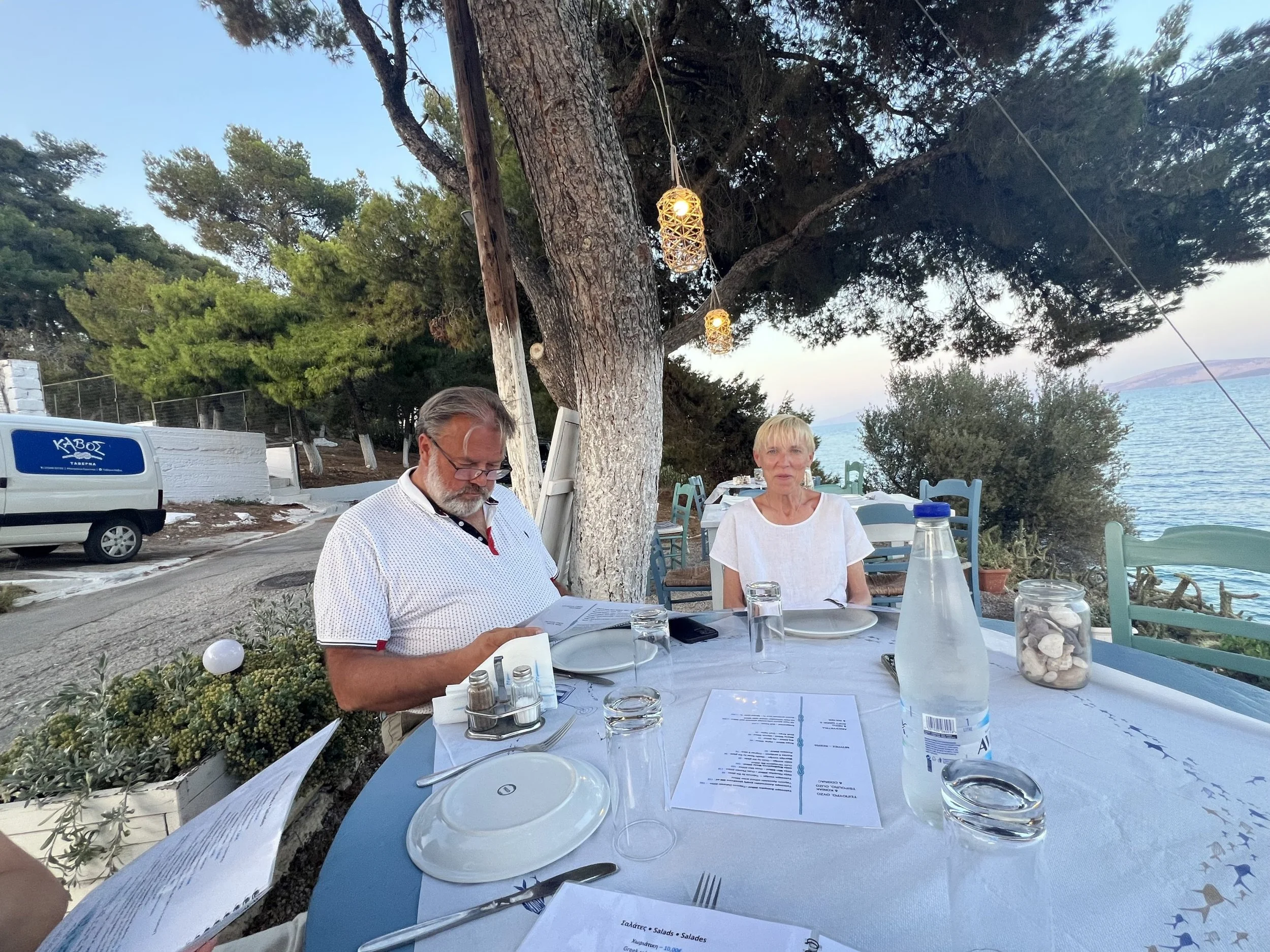 We gebruiken er een typisch Griekse fish and chips, met uitzondering van Ann, die zich aan een vissoepje waagt.