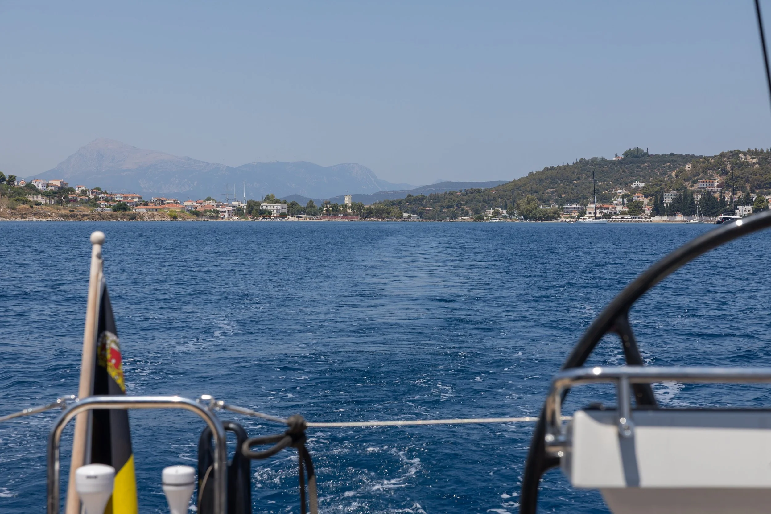 Volgens planning steken we vandaag de Saronische golf over. Een tocht van ongeveer 30 NM die we de laatste weken al meermaals verteerd hebben. Eens je in de buurt komt van Attica, aan de oostkant van de golf, speelt de invloed van de Meltemi, en is het bijna altijd erg winderig. Vandaag echter vertrekken we al met veel wind aan de westkant van de golf. De wind staat noord, dus het traject is in principe bezeilbaar. Maar de wind is erg variabel, met stevige windstoten, en de verwachting is dat de wind nog zal toenemen.