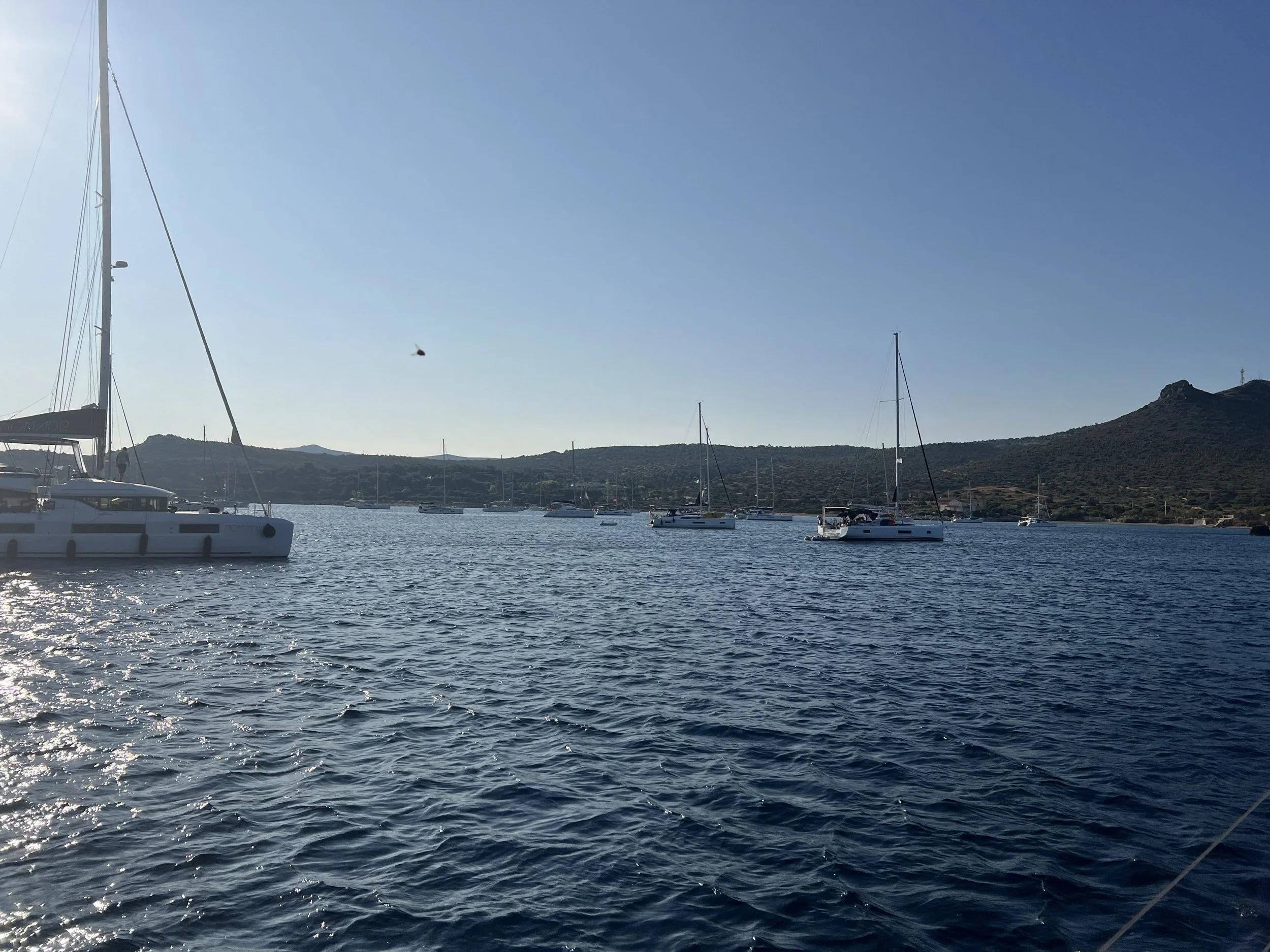 Er staat nog steeds veel wind, en de verwachting is dat deze nog zal toenemen. We zoeken een plaats tussen de talrijke jachten in de baai.