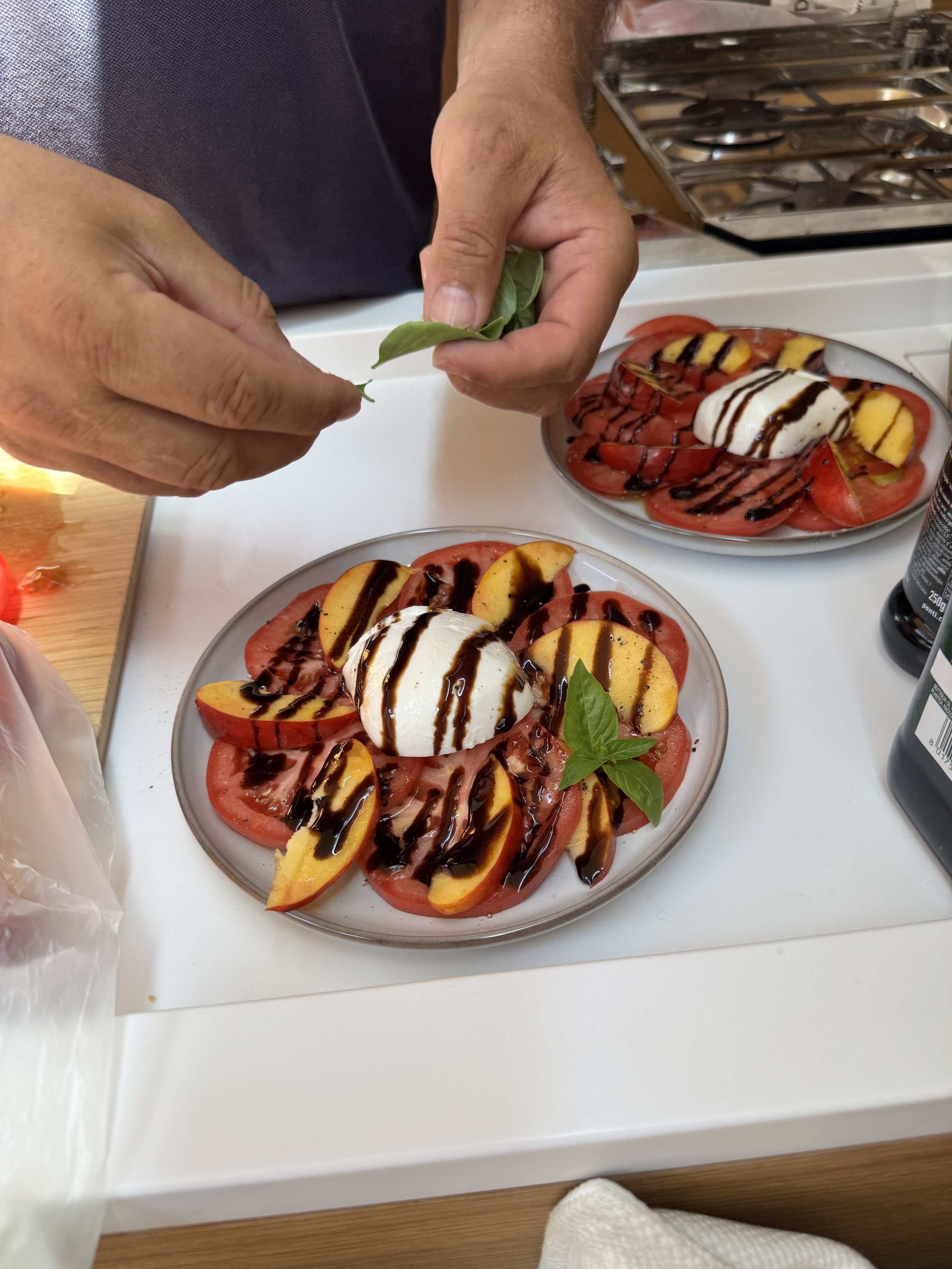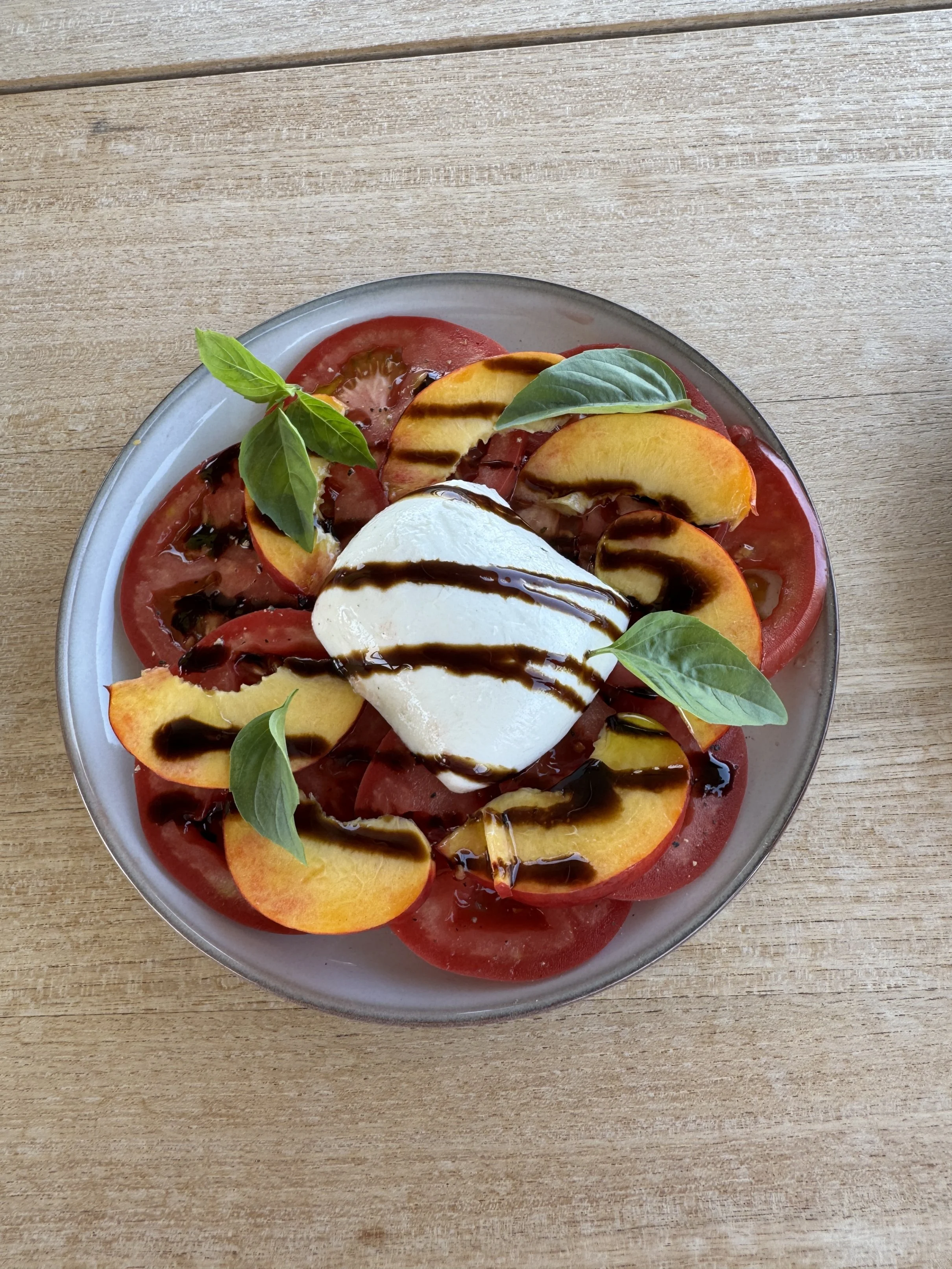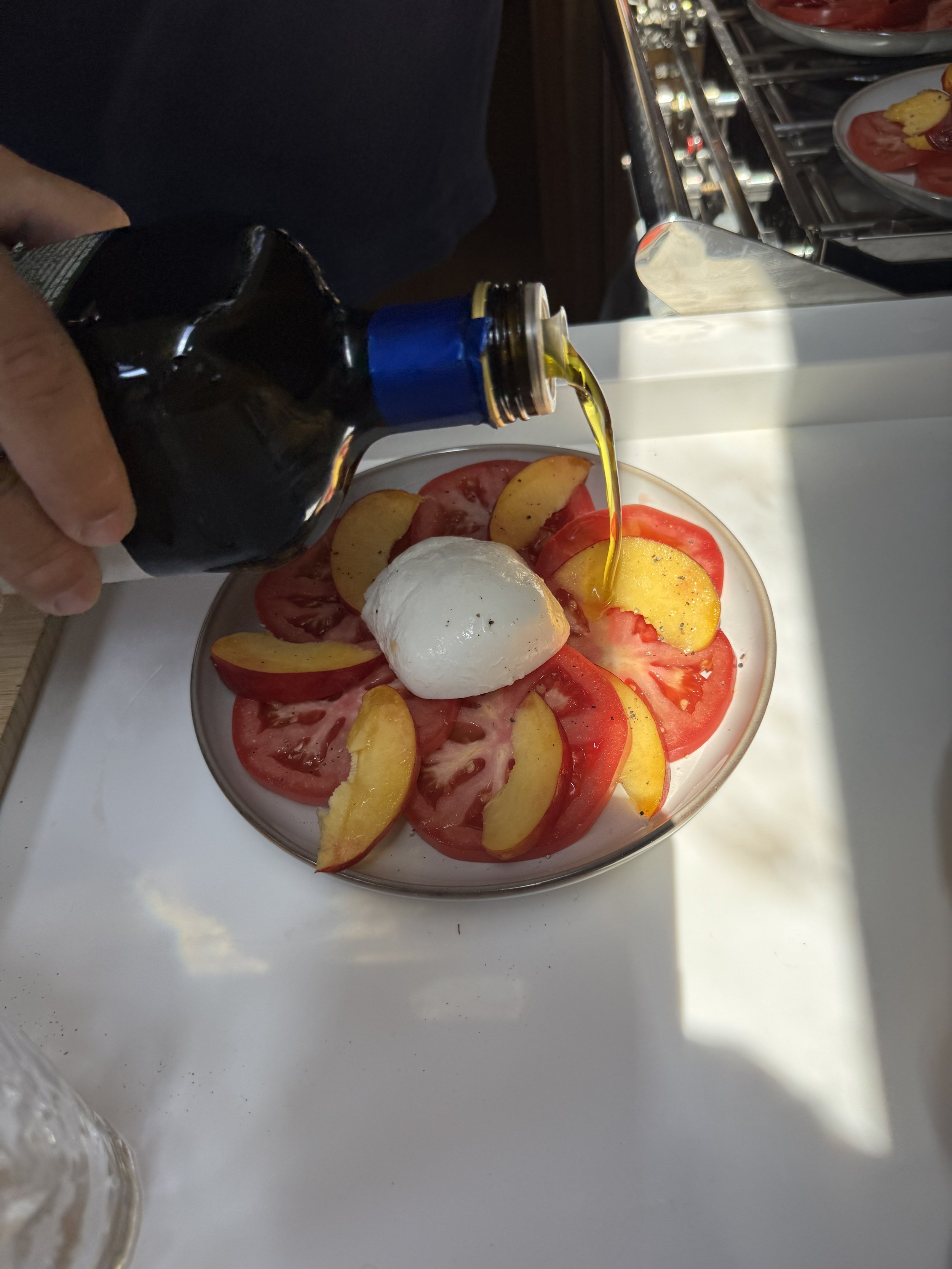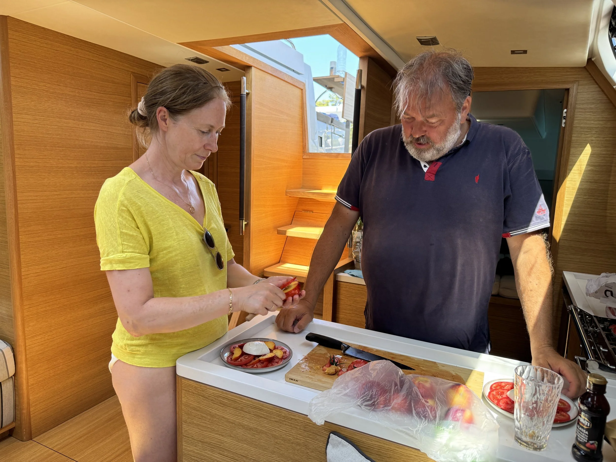 Er liggen twee zeilboten in de baai, onder Franse vlag. We sluiten mooi aan, laten het anker neer, en nemen een frisse duik in het water. Daarna ontfermen Daphne en Wouter zich over de lunch. Het wordt een variatie op de Italiaanse klassieker Insalate Caprese, met fruit, zoals we dat in Baie de Cupabia, Corsica, mochten ervaren in het strandrestaurant aldaar.