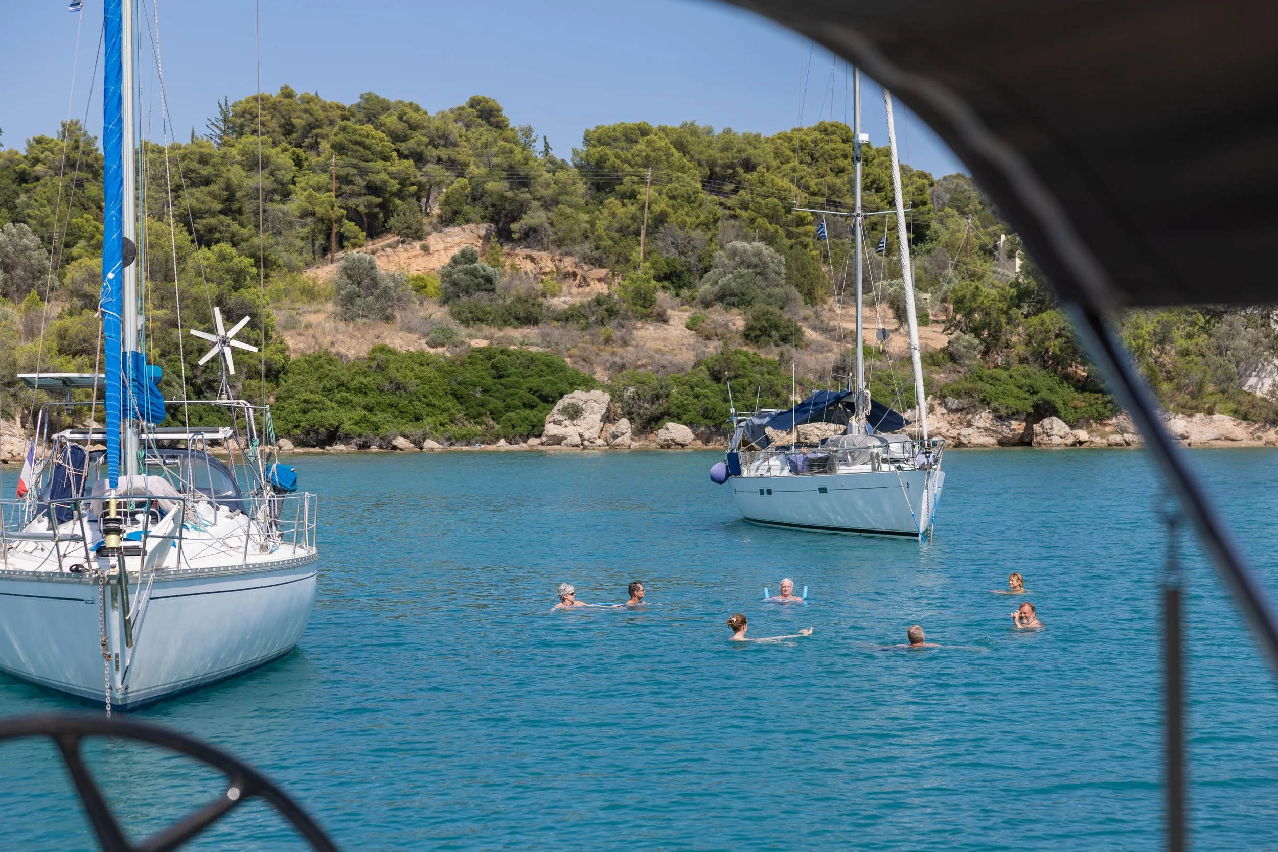 We nemen de namiddag vrij, en houden ons ledig met allerlei activiteiten, waaronder zwemmen, uiteraard. Wanneer we voorbij de naburige boten zwemmen, blijken de bewoners wel in te zijn voor een gezellige babbel. Het betreft twee koppels, elk met een boot, die al jaren samen door Griekenland varen, en daarbij ook regelmatig vrienden aan boord hebben. Het duurt niet lang of de ganse bende ligt in het water, als ware het een gezellig koffiehuis.