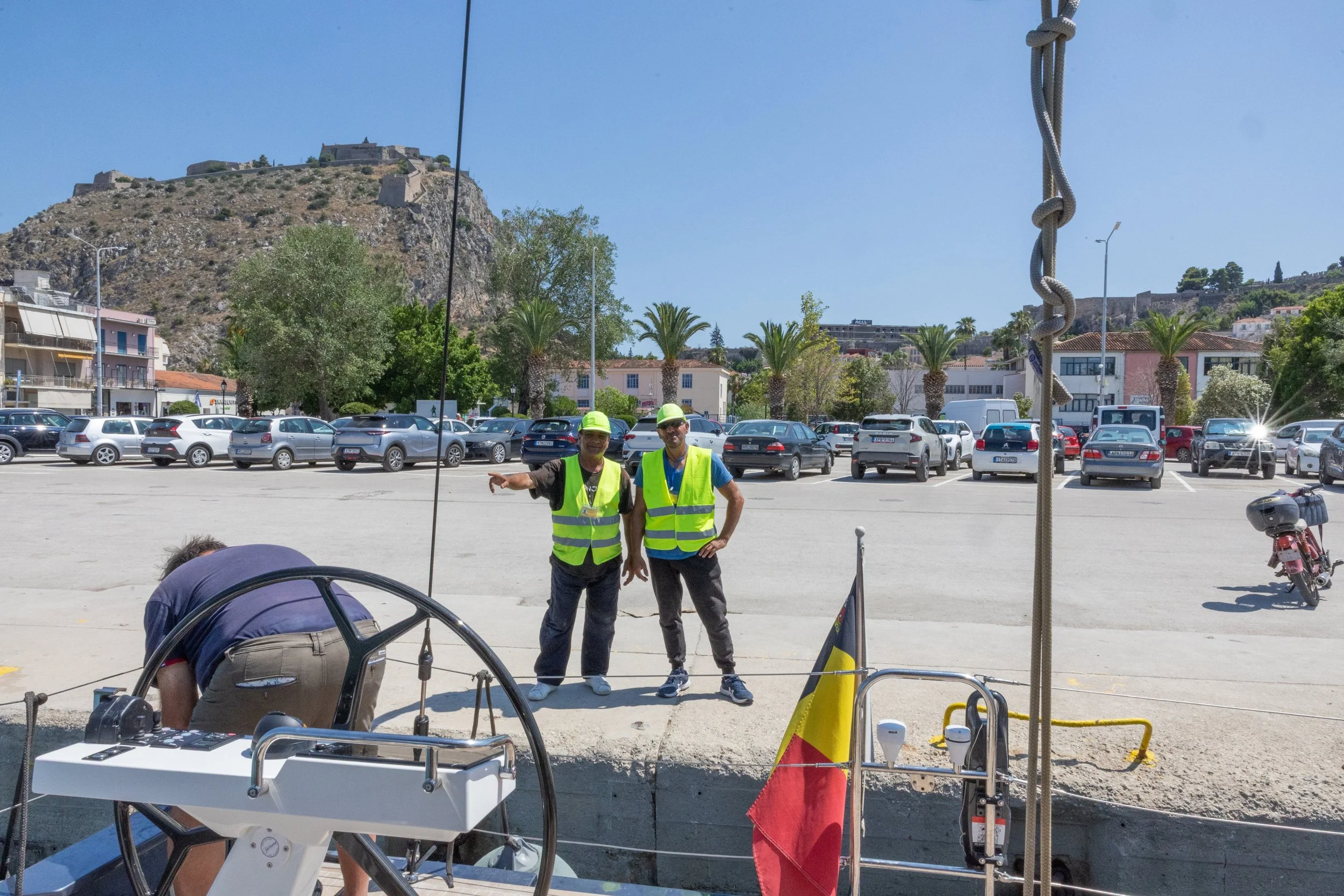 Twee mannen op de kade in werfkledij bieden spontaan hun diensten aan bij het aanmeren. De gebruikelijke tip wordt geweigerd, en we krijgen een factuur toegestopt. Geen liggeld, want dat wordt later geïnd door een dame die havenwachter blijkt te zijn.