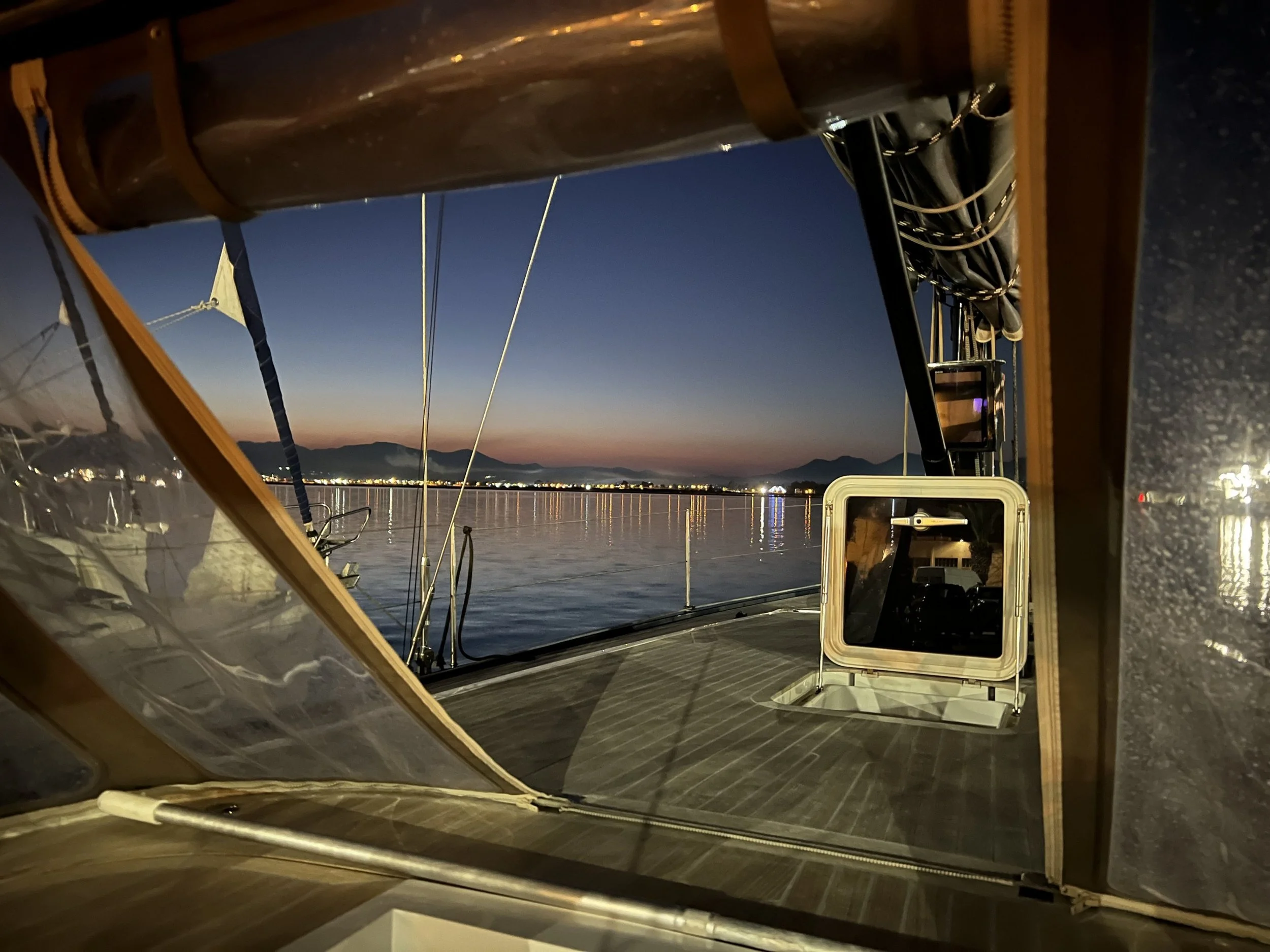 Terug aan boord stelt zich het typische dilemma, slapen op een boot in de haven. Met de luiken open kan de koelte van de nacht soelaas brengen, maar het is kiezen tussen de warmte en de muggen.