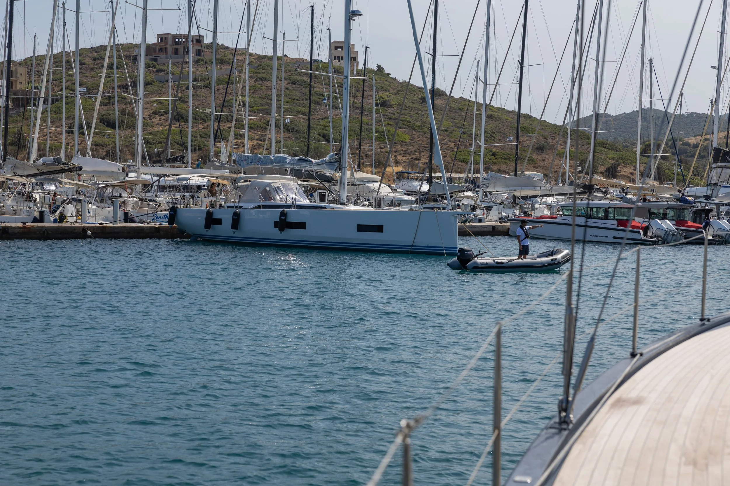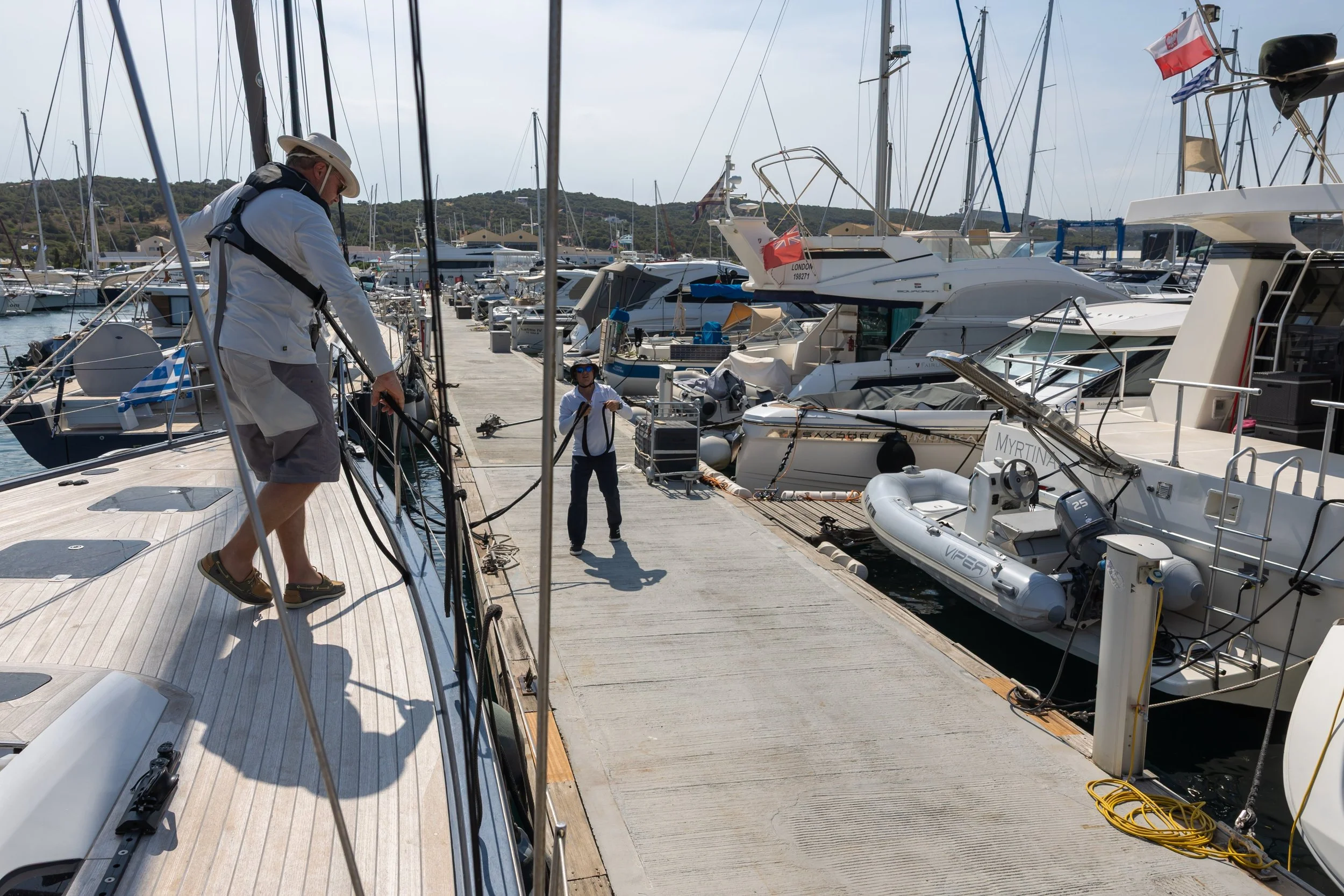 In de late namiddag begeven we ons dan toch naar Olympic Marine, omwille van de wind op motor nu. Op de zeestraat van Markonisos staat een felle noordooster, wat zijwind betekent in de haven. Wouter beslist on-board assistance te vragen om de boot veilig aan te meren in deze omstandigheden. Zoals nogal eens gebeurde, brengt men Nicolas met een rib tot op de boot voor we de haven binnenvaren.