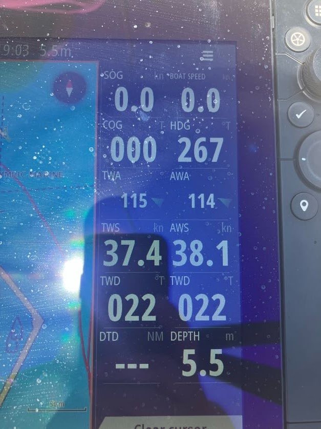 Zondag komen de voorspellingen uit. We meten 38 kn wind, ofwel 8 Bft, in de beschutting van de haven.