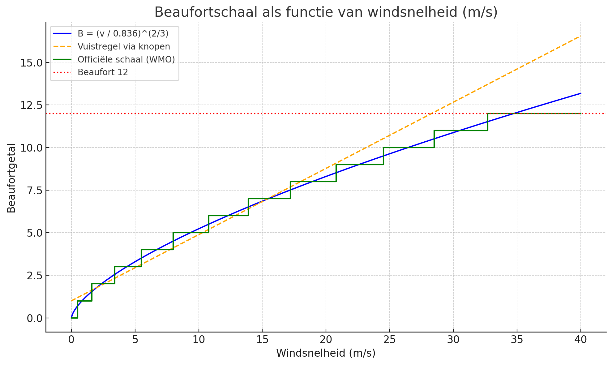 Een snelheid kan omgerekend worden naar de corresponderende waarde op de schaal van Beaufort met de formule (v/0.836)^(2/3), waarbij v de snelheid in m/s is. De omrekening van een snelheid uitgedrukt in kn naar m/s wordt gegeven als k*1.852/3.6, waarbij k de snelheid in kt is. Vermenigvuldigen met 1.852 om km/u te bekomen, en vermenigvuldigen met 1000/3600 om m/s te krijgen.