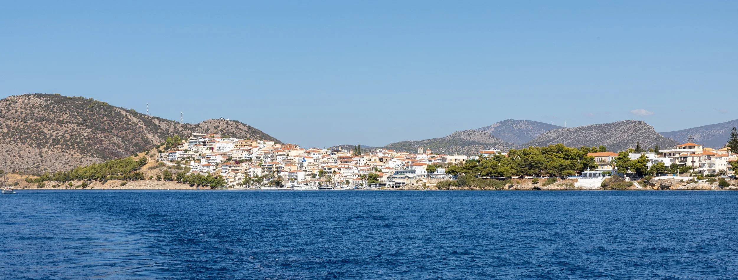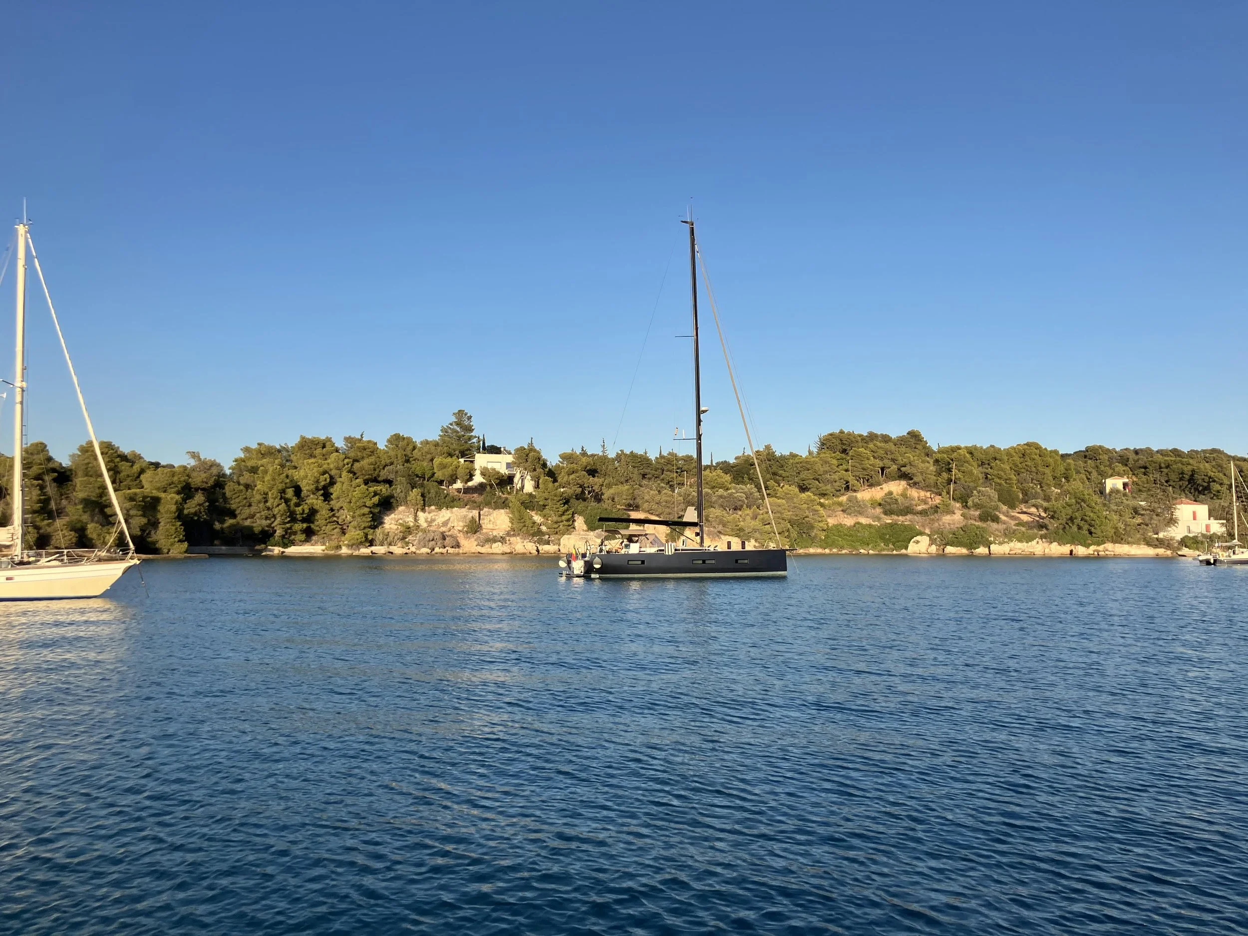 Tussen het eiland Dokos en het vasteland hebben we weer even de motor nodig om de chaotische wind in de zeeëngte te overwinnen. Op open zee neemt de wind eerst wat toe, maar gaat daarna liggen beneden de 5 kt. We besluiten de zeilen te strijken en het traject verder op motor af te leggen.