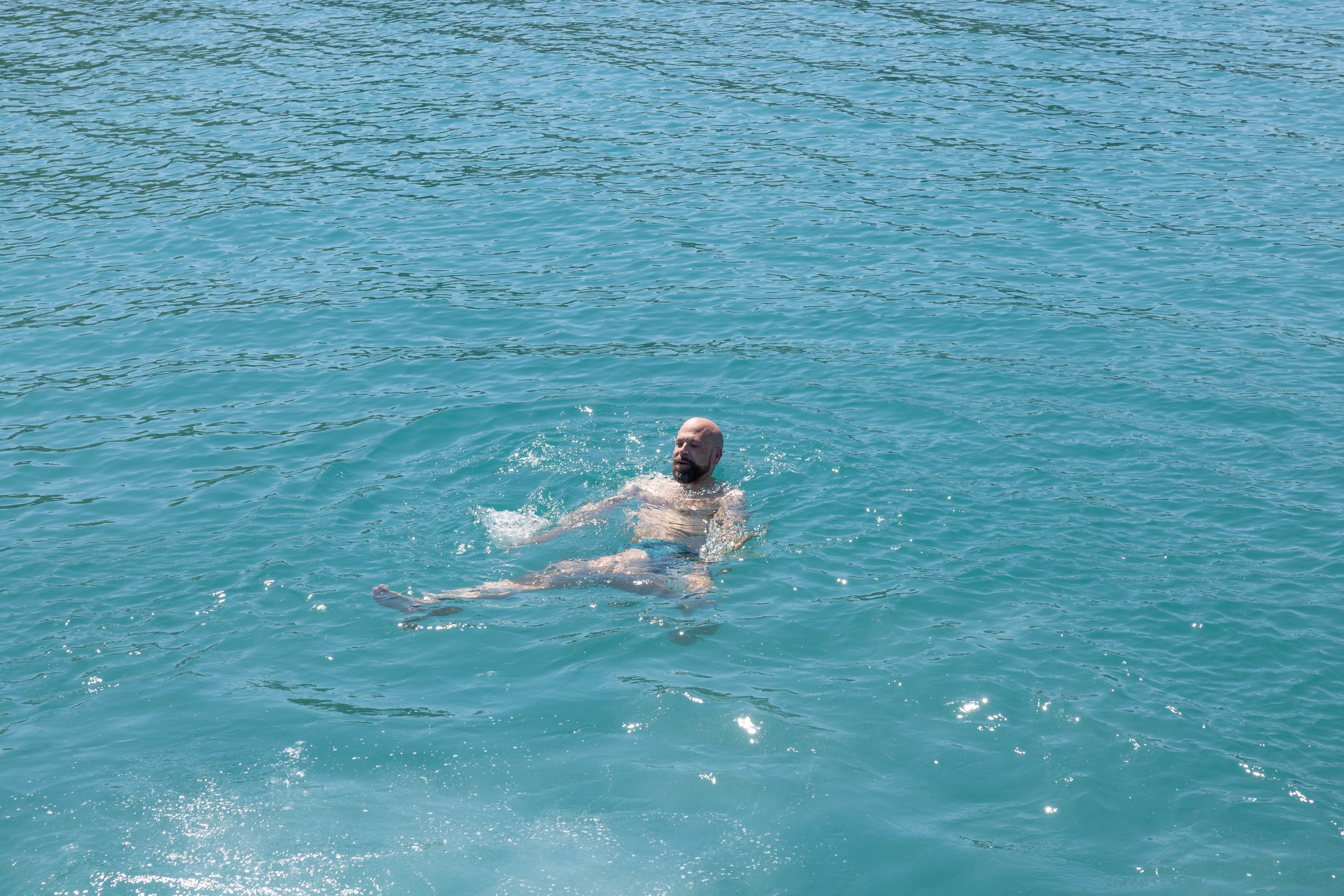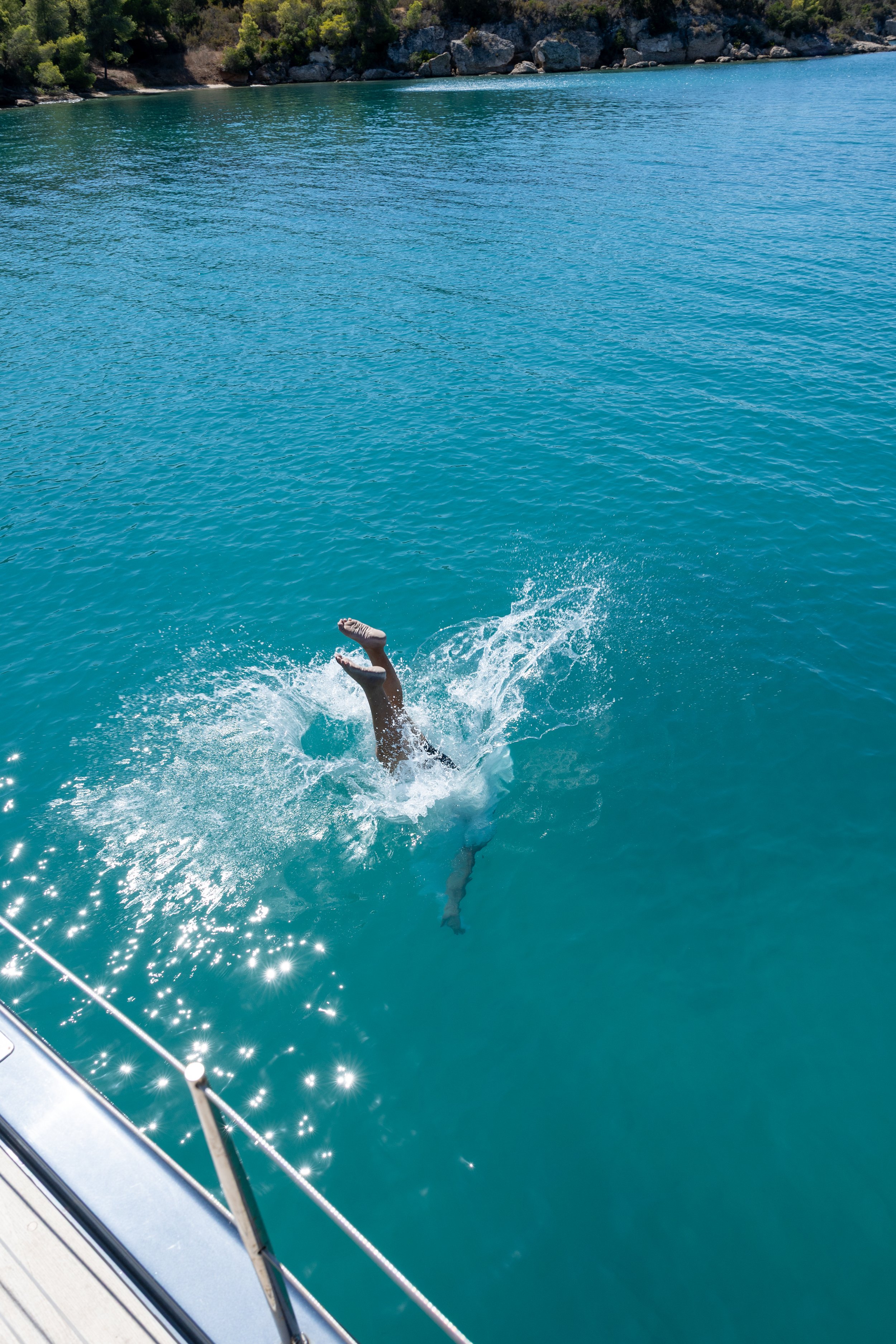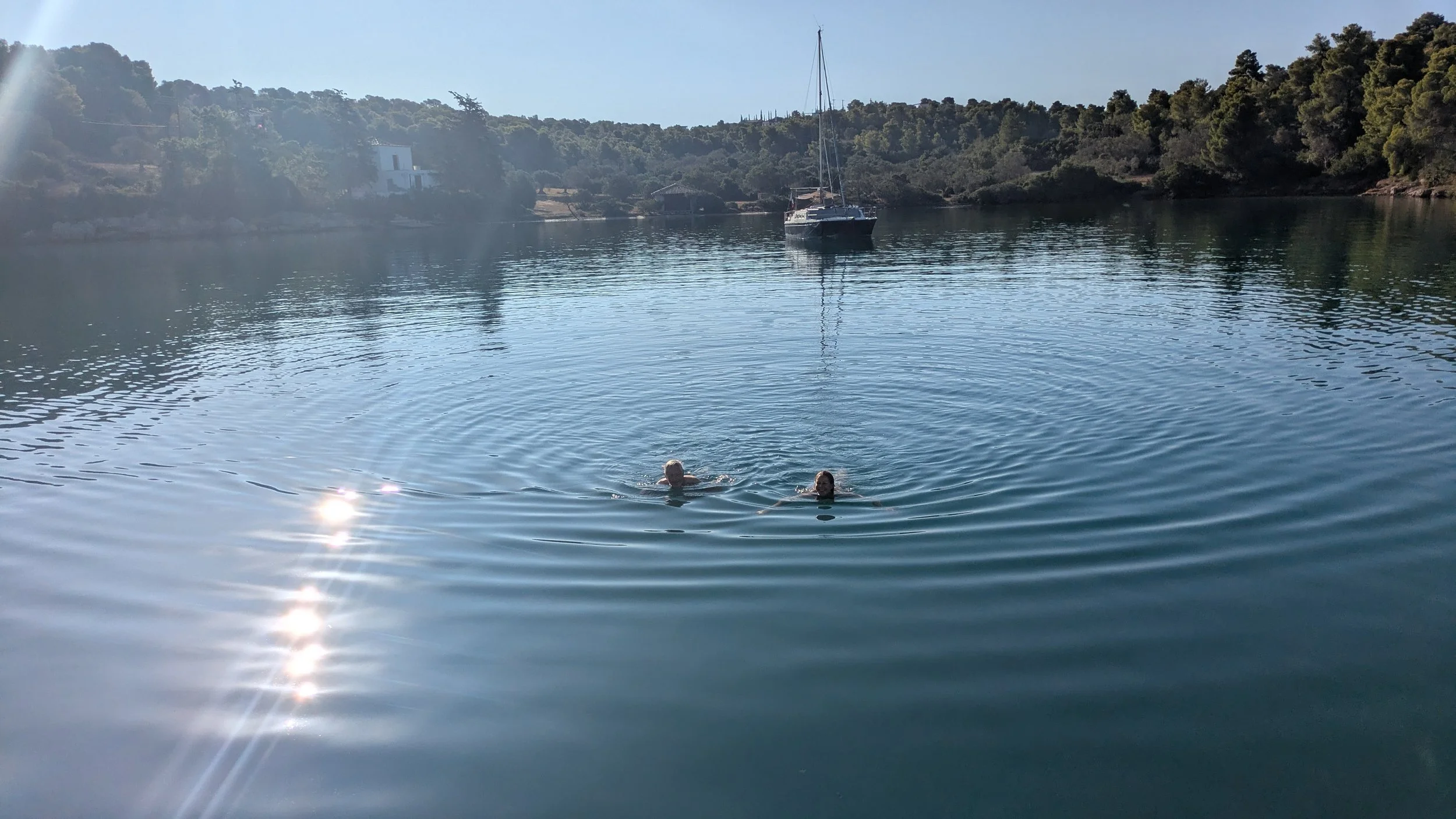 In de baai van Porto Cheli liggen een handvol boten voor anker. Er is echter nog plaats in het diepst van de baai, waar de diepte tot 3m60 afneemt. Met weinig wind volstaat 20m ankerketting. De volgende stap ? Zwemmen, meer bepaald boegduiken, 2de editie. Alle protagonisten laten beurtelings hun kunnen zien.