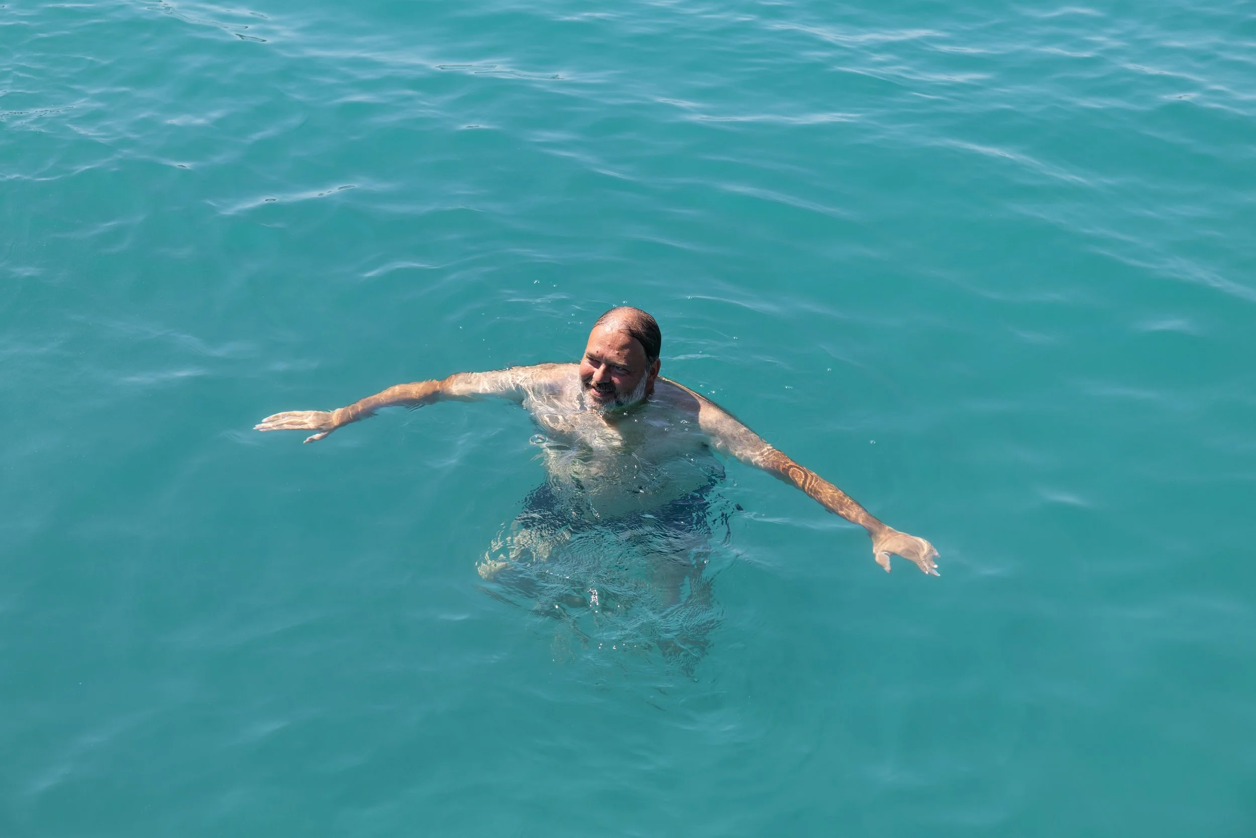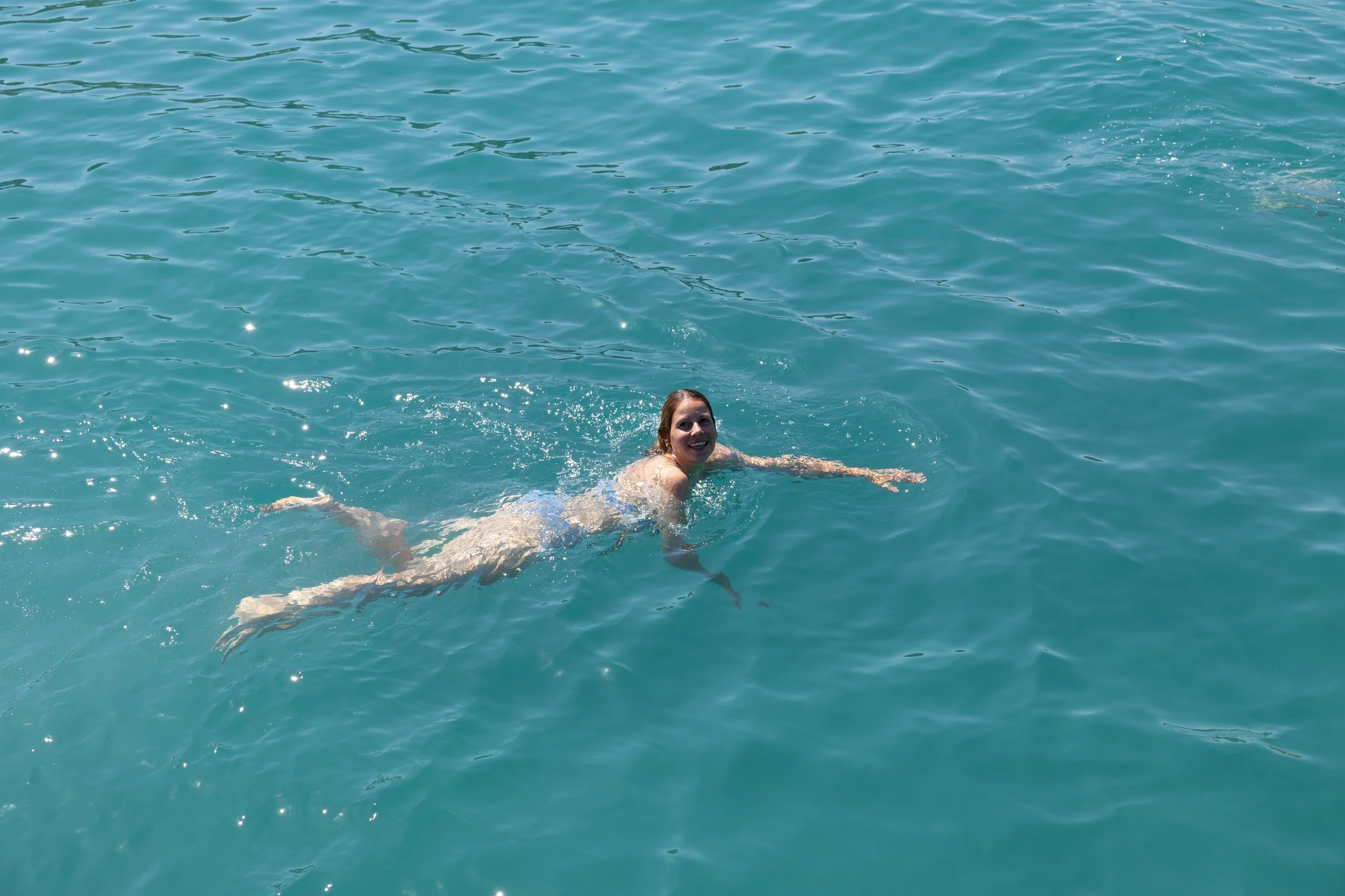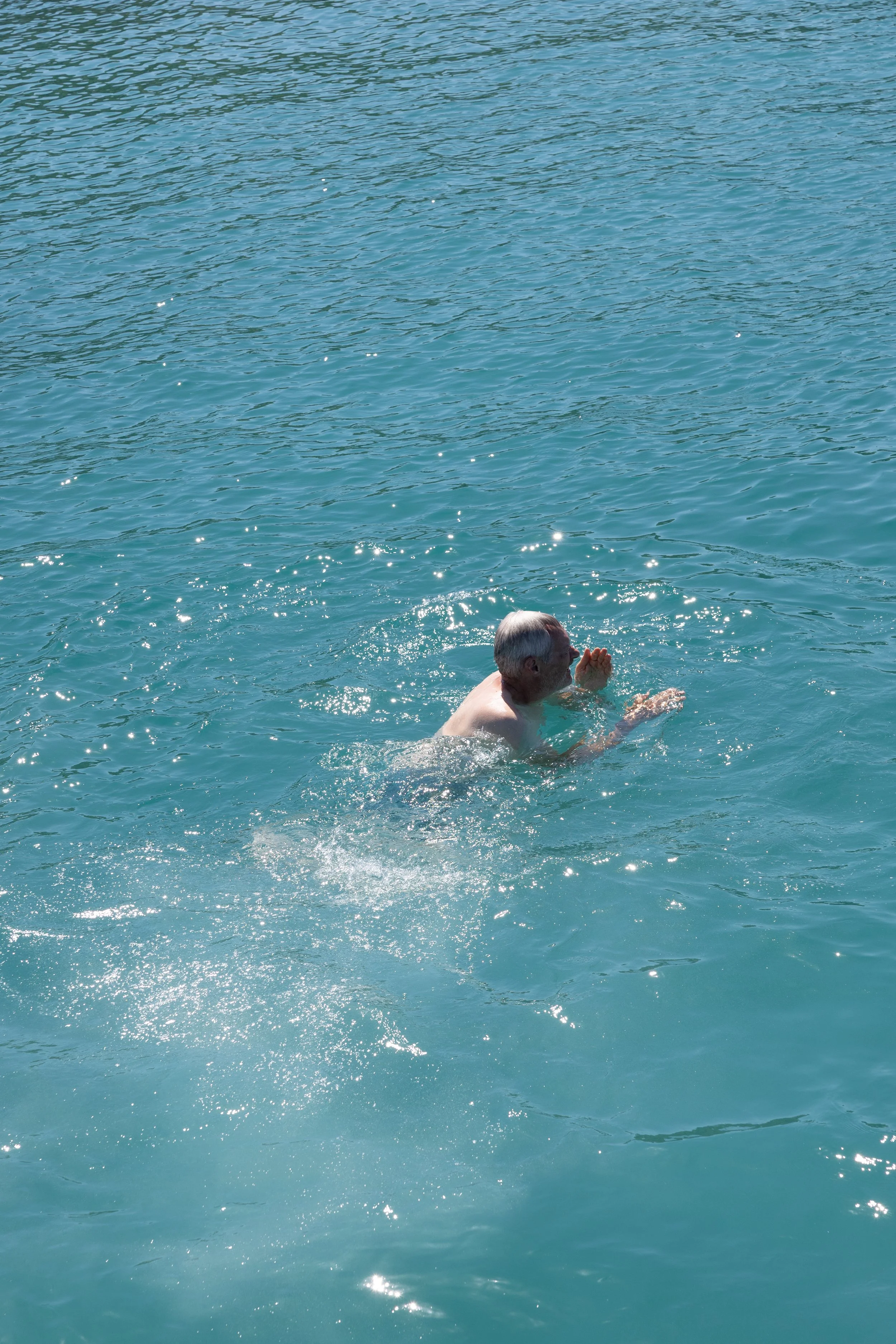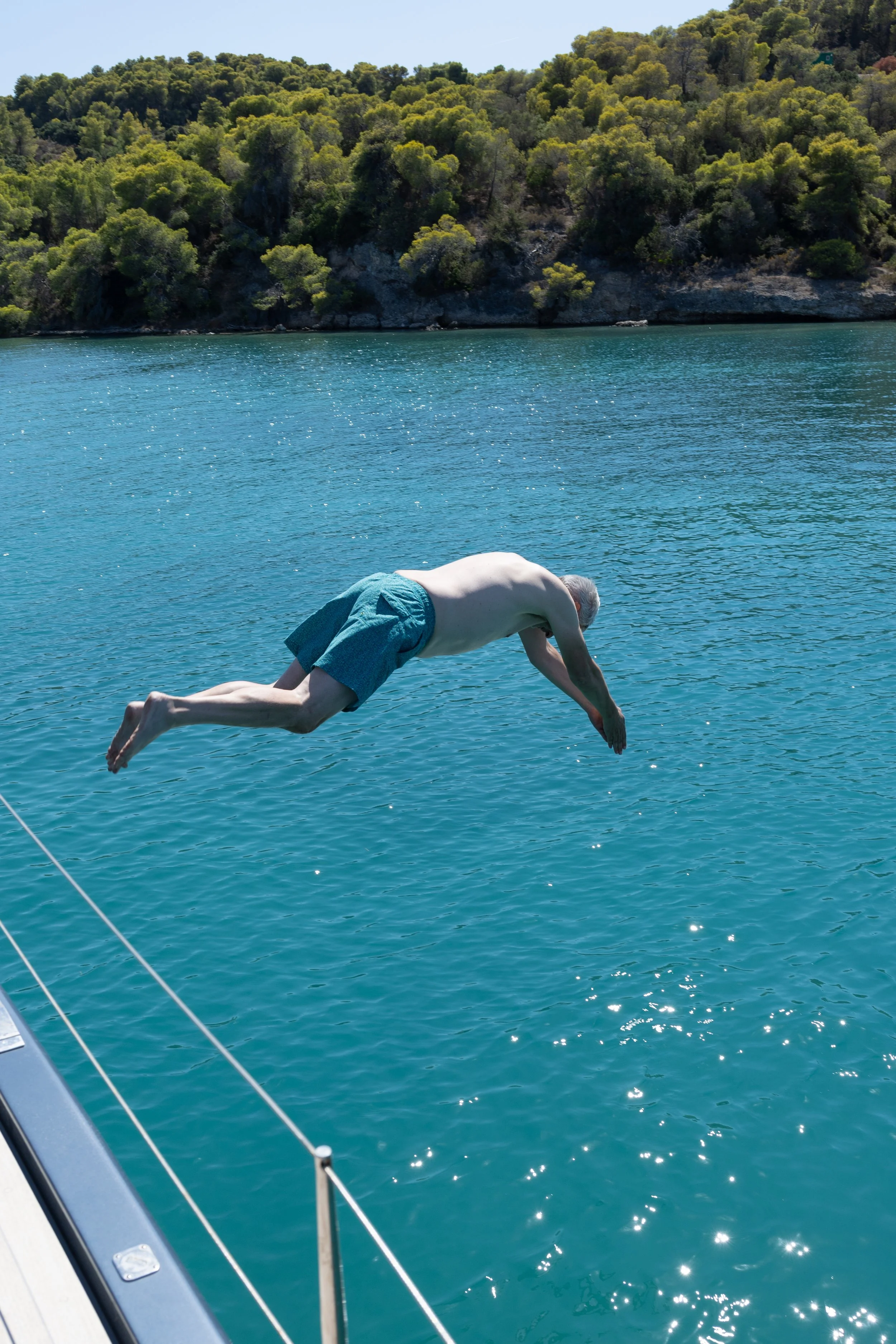 In de baai van Porto Cheli liggen een handvol boten voor anker. Er is echter nog plaats in het diepst van de baai, waar de diepte tot 3m60 afneemt. Met weinig wind volstaat 20m ankerketting. De volgende stap ? Zwemmen, meer bepaald boegduiken, 2de editie. Alle protagonisten laten beurtelings hun kunnen zien.