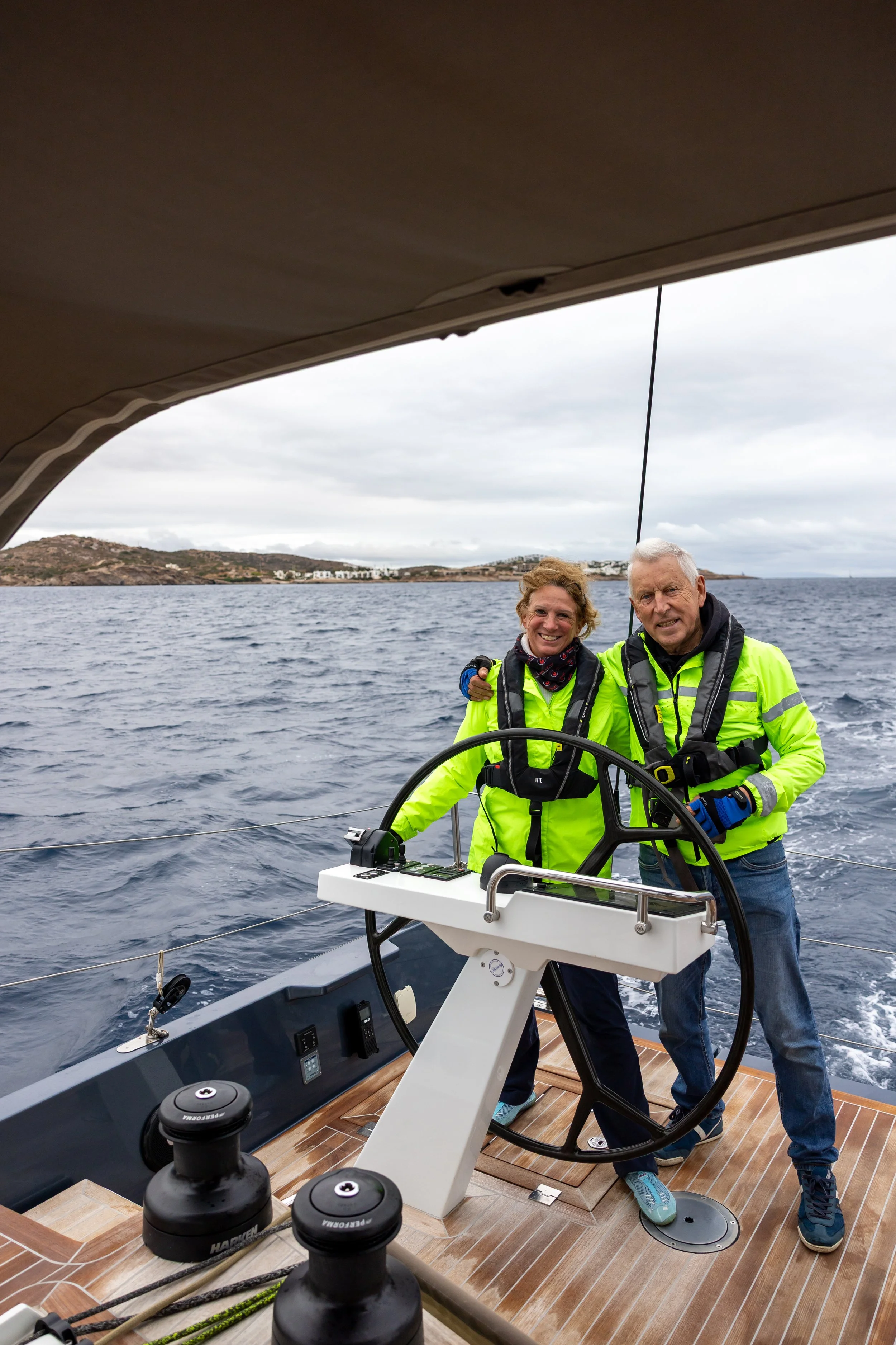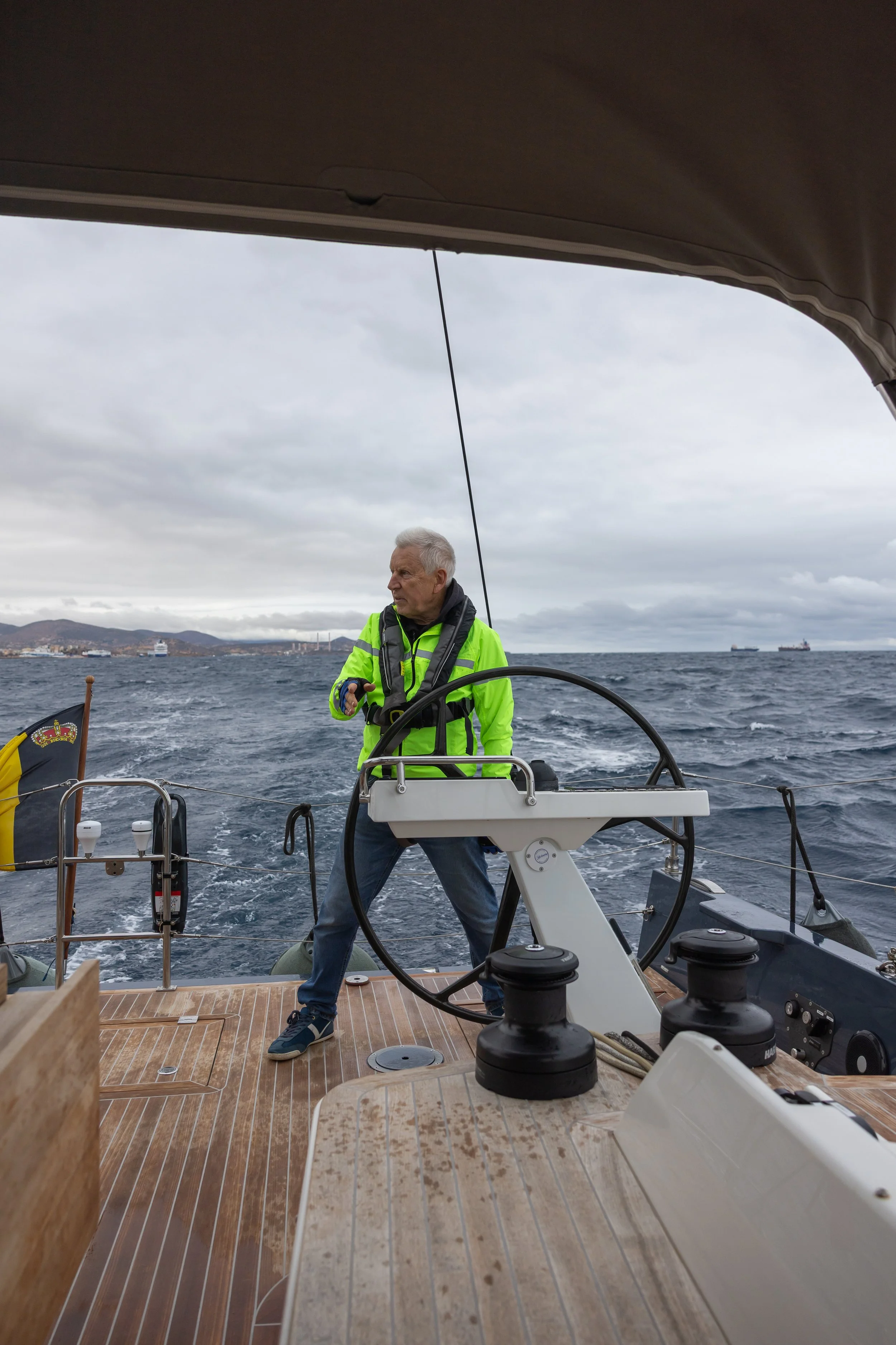 Bij het vertrek uit de haven manen de omstandigheden aan tot voorzichtigheid. Er staat flink wat wind tussen het eiland Markonisos en Attica, de golven komen zijwaarts, wat de boot doet rollen, en de lucht is dreigend grijs, zoals de foto getuigd. Allen een reddingsvest aan dus.