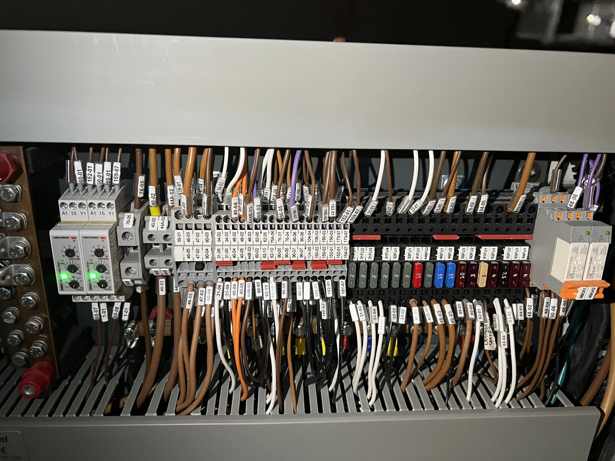 Wat het ook is, de bilge pump weigert dienst nu. Telefonisch overleg met Dimitris, specialist van de nieuwe 50 van Solaris bij Fast Sailing. De hypothese is dat de zekering van de bilge pump gesprongen is, omdat deze lucht gezogen heeft. Zeker zijn we niet, en ook de zekering blijkt onvindbaar. Op elke boot anders, zo blijkt. Met bekabeling gecentraliseerd op verschillende panelen.