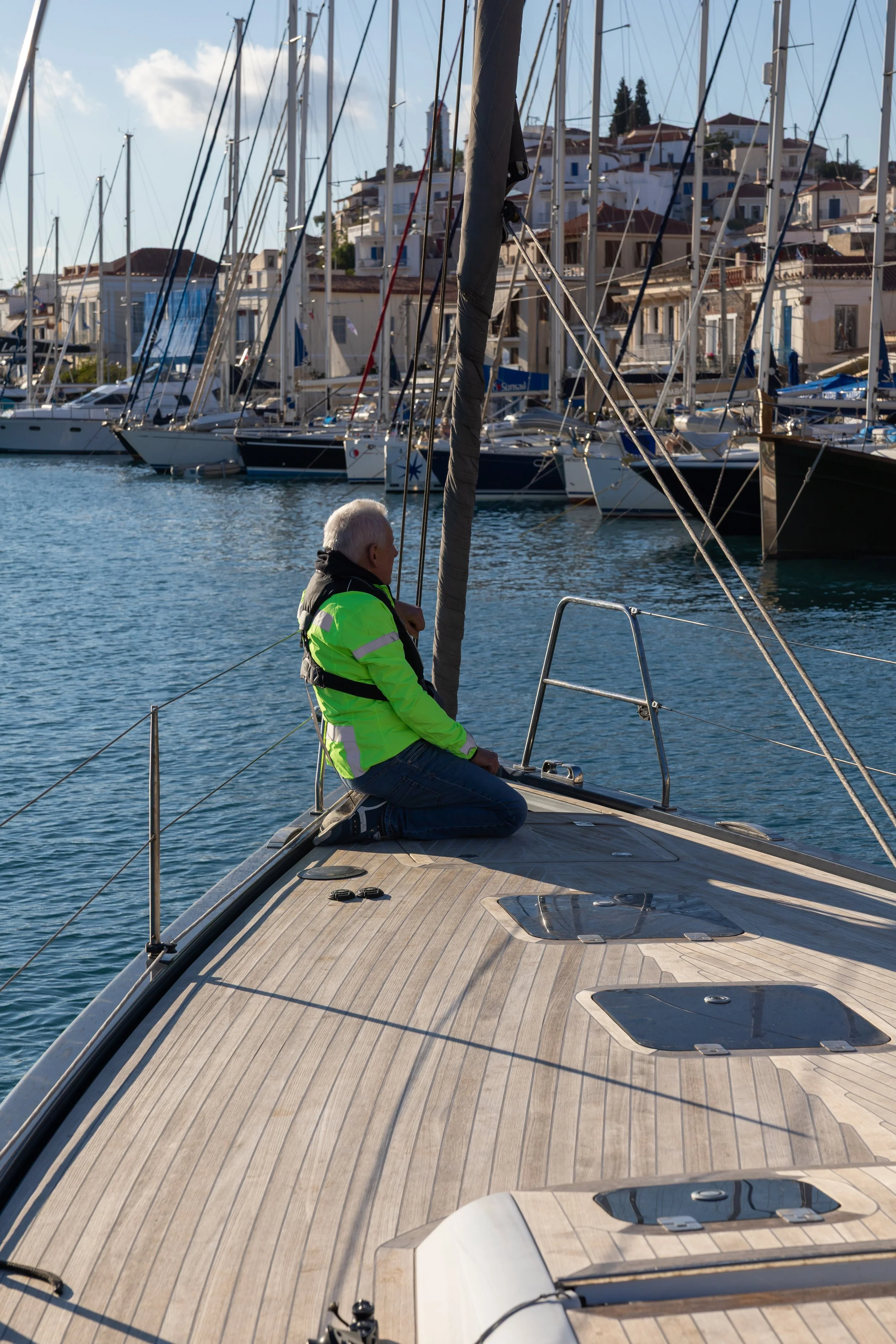 We halen het anker op. Dat verloopt moeilijk, omdat we elkaar niet horen door het kabaal van de kazerne. Daarna varen we naar de haven van Poros.