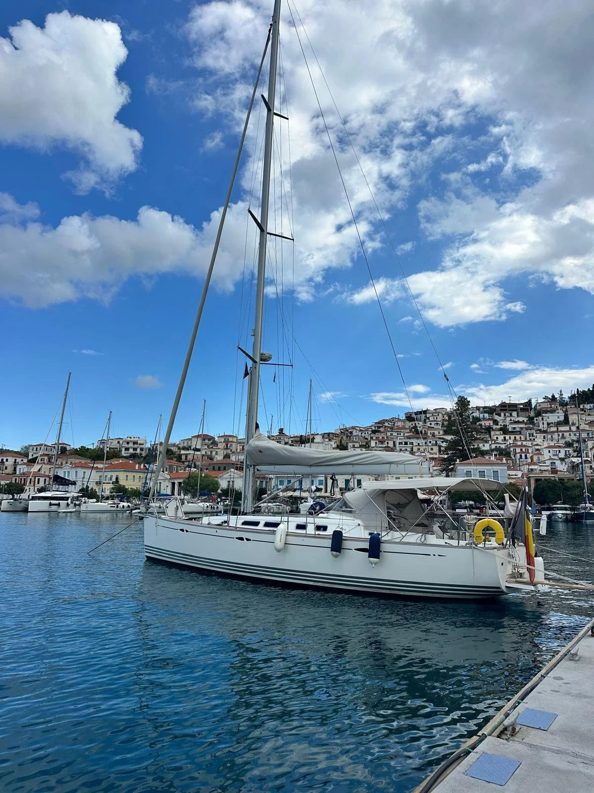 Zodra Wouter de koers kan bijstellen en de golven achterwaarts komen, worden de fenders alsnog binnen gehaald. We krijgen 8 kt tot 16 kt in de Saronische golf, en hijsen grootzeil en fok. Wanneer de wind mildert, zetten we de motor bij. We halen voortdurend meer dan 7 kt bootsnelheid.